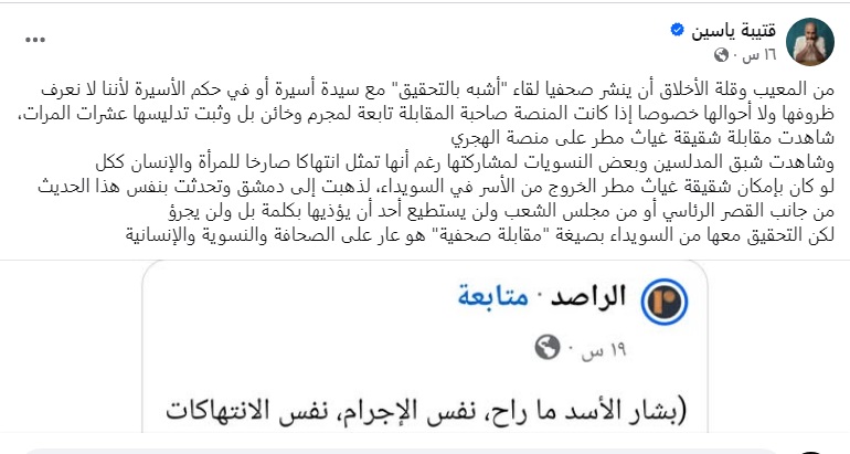 وقال إنه «لو كان بإمكان شقيقة غياث مطر الخروج من الأسر في السويداء، لذهبت إلى دمشق وتحدثت بنفس هذا الحديث من جانب القصر الرئاسي أو من مجلس الشعب ولن يستطيع أحد أن يؤذيها بكلمة بل ولن يجرؤ لكن التحقيق معها من السويداء بصيغة “مقابلة صحفية” هو عار على الصحافة والنسوية والإنسانية».