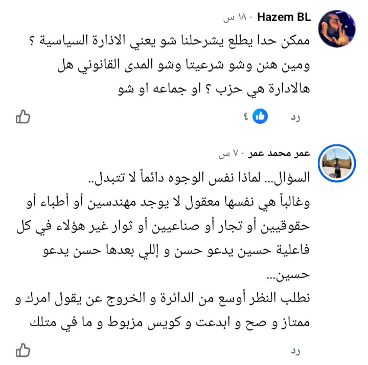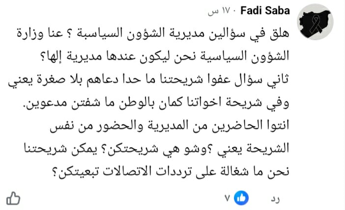 في التعليقات وجّه “فادي” سؤالين الأول حول مديرية الشؤون السياسية، حيث سأل هل لدينا وزارة شؤون سياسية ليكون لها مديريات في المحافظات؟، والسؤال الثاني قال فيه أن شريحته لم يدعُها أحد للاجتماع وشريحة أخوته في الوطن لم يدعهم أحد أيضاً، متسائلاً ما إذا كان الحاضرون من المديرية والحضور ينتمون للشريحة نفسها، وما هي هذه الشريحة؟.
