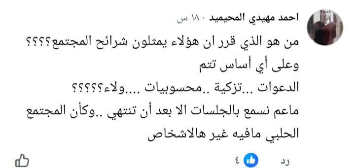 من جانب آخر، فإن طريقة إدارة وتنظيم الاجتماعات الرسمية واختيار المدعوين للمشاركة فيها لا تزال غامضة ودون معايير واضحة، فمثلاً لا يقوم اختيار ممثلي “شرائح المجتمع” على دعوة النقابيين مثلاً ليمثّلوا شرائحهم المهنية، ولا دعوة لجان الأحياء لتمثيل الشرائح بناءً على أحيائهم، ولا يوجد أي معيار لهذا الاختيار سوى إرادة من يضع الأسماء وينظّم هذه اللقاءات، الأمر الذي أثار استياء الأهالي وهو ما ظهر في تعليقاتهم.