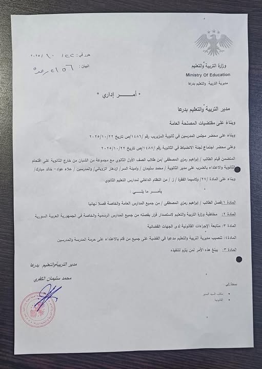 مديرية التربية في “درعا” سارعت بإصدار قرار بناءً على محضر مجلس المدرسين في ثانوية “المزيريب” ومحضر اجتماع لجنة الانضباط في الثانوية، والذي تضمّن قيام الطالب “إبراهيم المصطفى” من طلاب الصف الأول الثانوي مع مجموعة من الشبان من خارج الثانوية باقتحام المدرسة والاعتداء بالضرب على مديرها “محمد سليمان” وأمينة السر “ازدهار الزوياني” والمدرّسين “علاء عواد” و”خالد المبارك”.