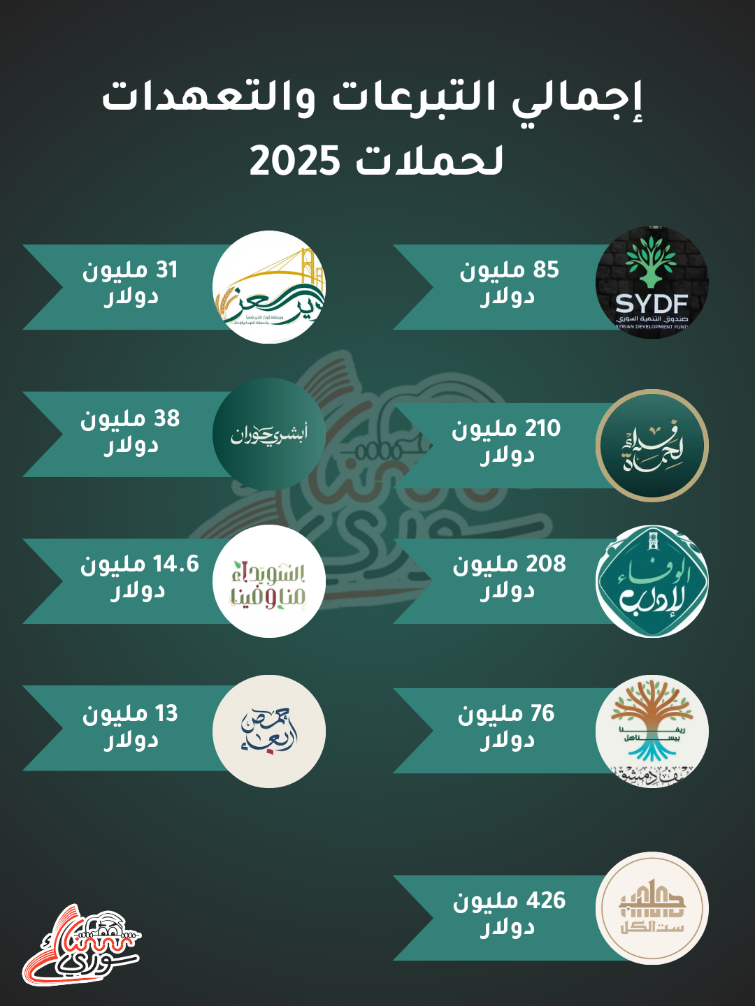 في حين، انطلقت خلال العام الماضي حملات للتبرع في مختلف المحافظات السورية بهدف إسهام المجتمعات المحلية في عمليات إعادة الإعمار وإصلاح البنى التحتية على مستوى المناطق.