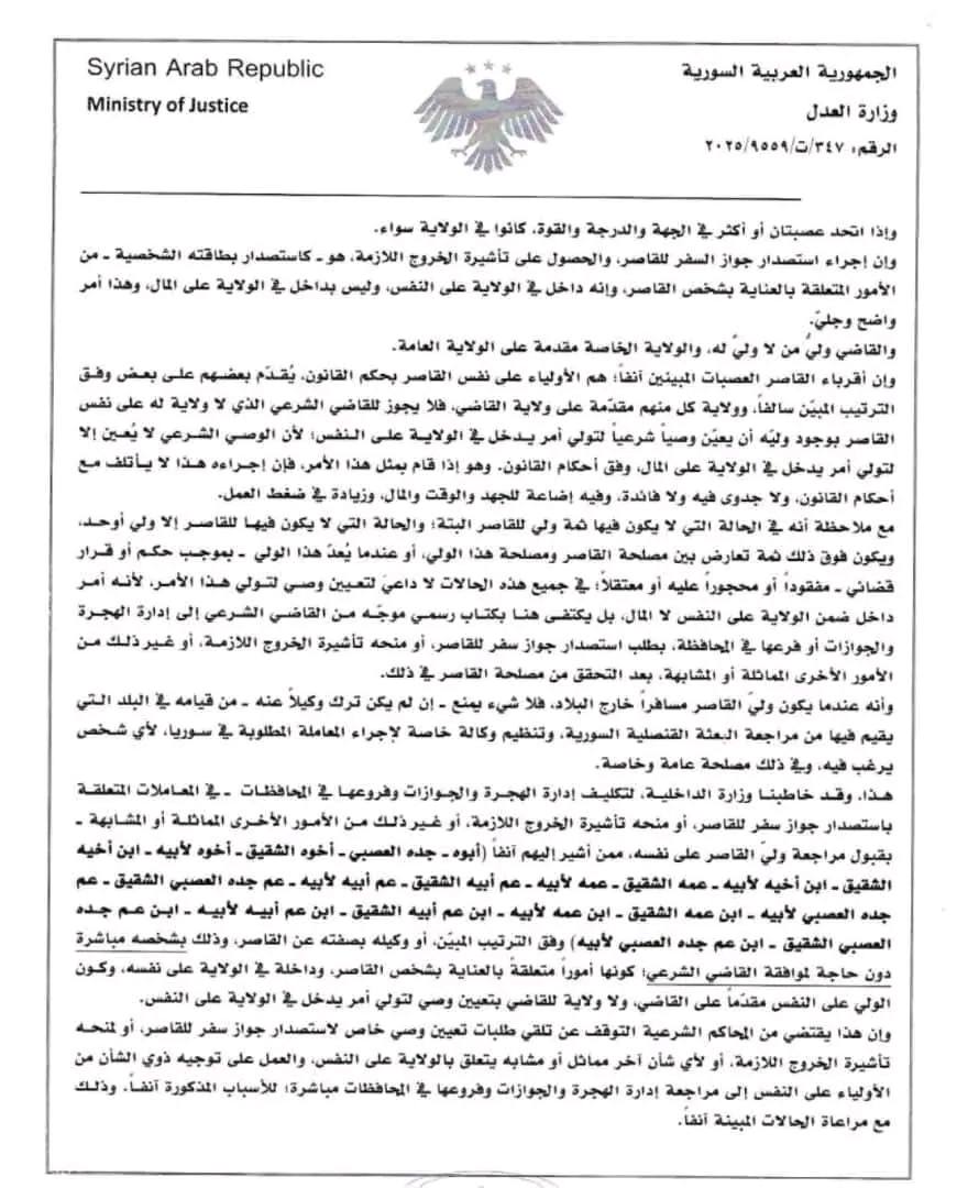 التعميم الصادر حديثاً لم يأتِ بجديد على صعيد تراتبية حق الولاية على القاصر، إذ أعاد التأكيد على تطبيق مواد القانون المدني وقانون الأحوال الشخصية، والتي تنص على منح الولاية على نفس القاصر للأب ثم الجد العصبي ثم الأخ الشقيق مروراً بأعمام الطفل وأعمام الأب وأعمام الجد وصولاً إلى ابن عم الجد العصبي، إلا أنه ألغى شرط موافقة القاضي الشرعي في مسائل استصدار جواز سفر أو تأشيرة خروج للقاصر، والاكتفاء بحضور الوصي الشرعي، وتوقف المحاكم الشرعية بالتالي عن تلقي طلبات تعيين وصي خاص لاستصدار جواز سفر أو تأشيرة خروج أو أي شأن آخر يدخل في الولاية على النفس.