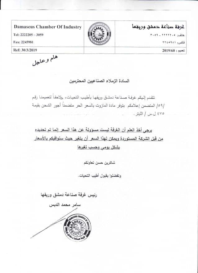 غرفة صناعة “دمشق” سارعت لإخلاء مسؤوليتها عن السعر المطروح، والذي تم تحديده من قبل الشركة المستوردة، مع إمكانية تعديل السعر في أي وقت وذلك عبر تعميم صادر عن الغرفة، والتي توقع رئيسها “سامر الدبس” انخفاض السعر لحوالي 400 ليرة لليتر في الأيام القليلة القادمة عند دخول مستوردين آخرين على الخط.