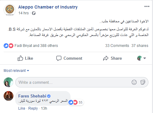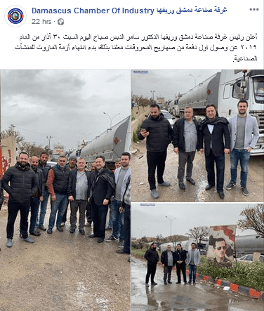 إشارات الاستفهام زادت أيضاً بالتزامن مابين إعلان غرفة صناعة “دمشق” عن وصول الشحنات على صفحتها على الفيسبوك، وما بين إعلان غرفة صناعة “حلب” عن تأمين المشتقات النفطية للصناعيين بأفضل الأسعار بالتعاون مع شركة B.S، الخاصة والتي عادت للتوزيع مؤخراً بالسعر الحكومي الرسمي البالغ 293 لليتر، بحسب ما علق رئيس اتحاد غرف الصناعة “فارس الشهابي” على صفحة الغرفة.