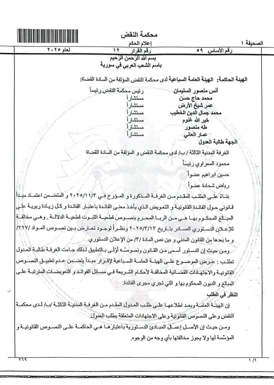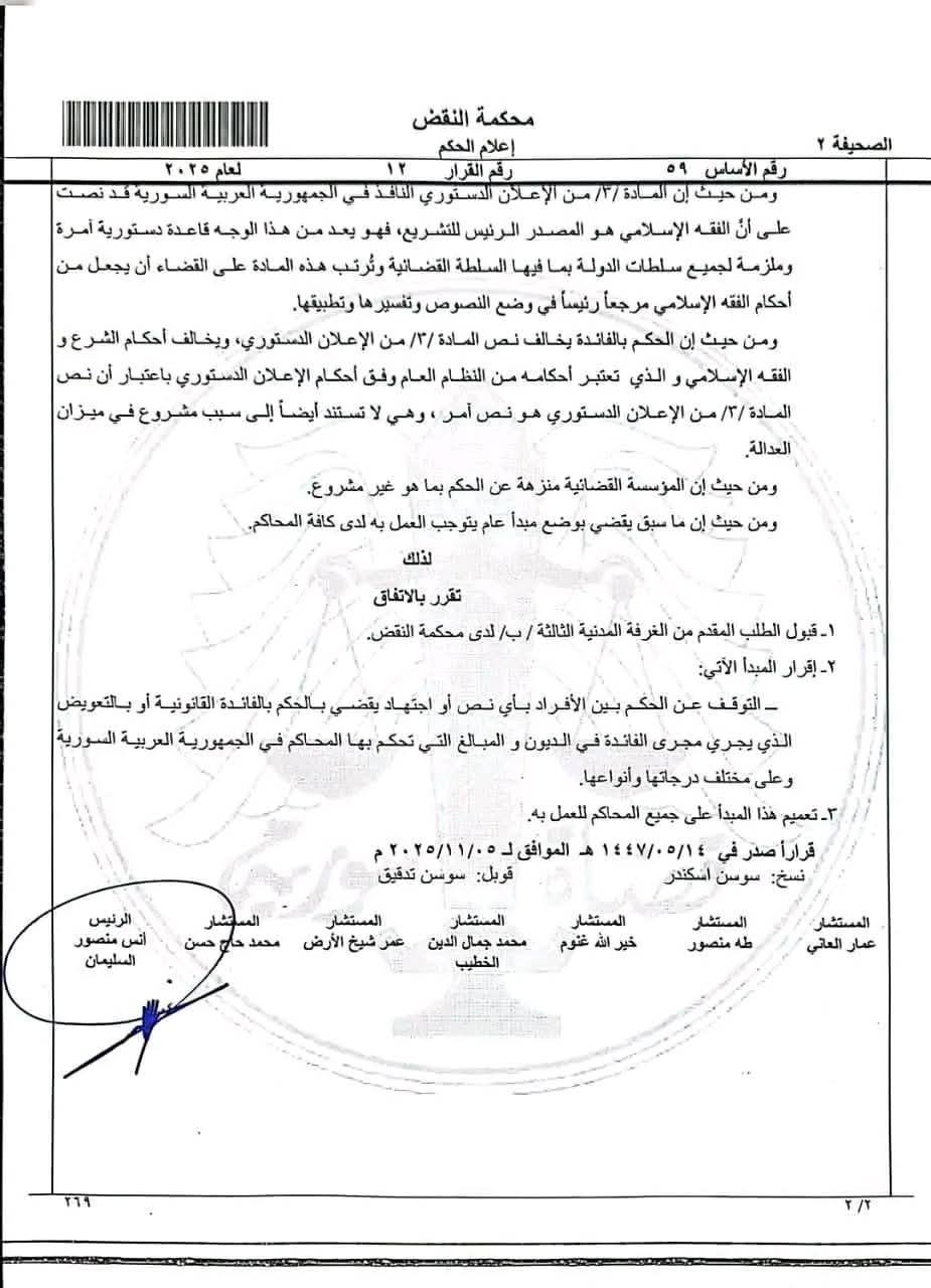 أصدرت محكمة النقض السورية قراراً ينص على الإقرار بوقف إصدار أحكام قضائية للأفراد بمبالغ “الفائدة القانونية” معتبرة ذلك مخالفاً لمبادئ الشريعة الإسلامية والإعلان الدستوري ما أثار جدلاً بين الحقوقيين.