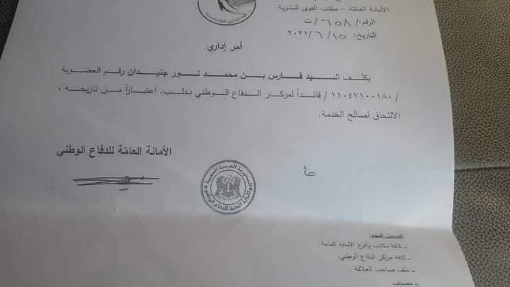 ونصّ القرار الذي يحمل تاريخ أمس والصادر عن الأمانة العامة للدفاع الوطني، على تكليف “جنيدان” وهو نائب مستقل عن ريف “حلب”، بمهمة قيادة “الدفاع الوطني” في “حلب” اعتباراً من تاريخ صدور القرار.
