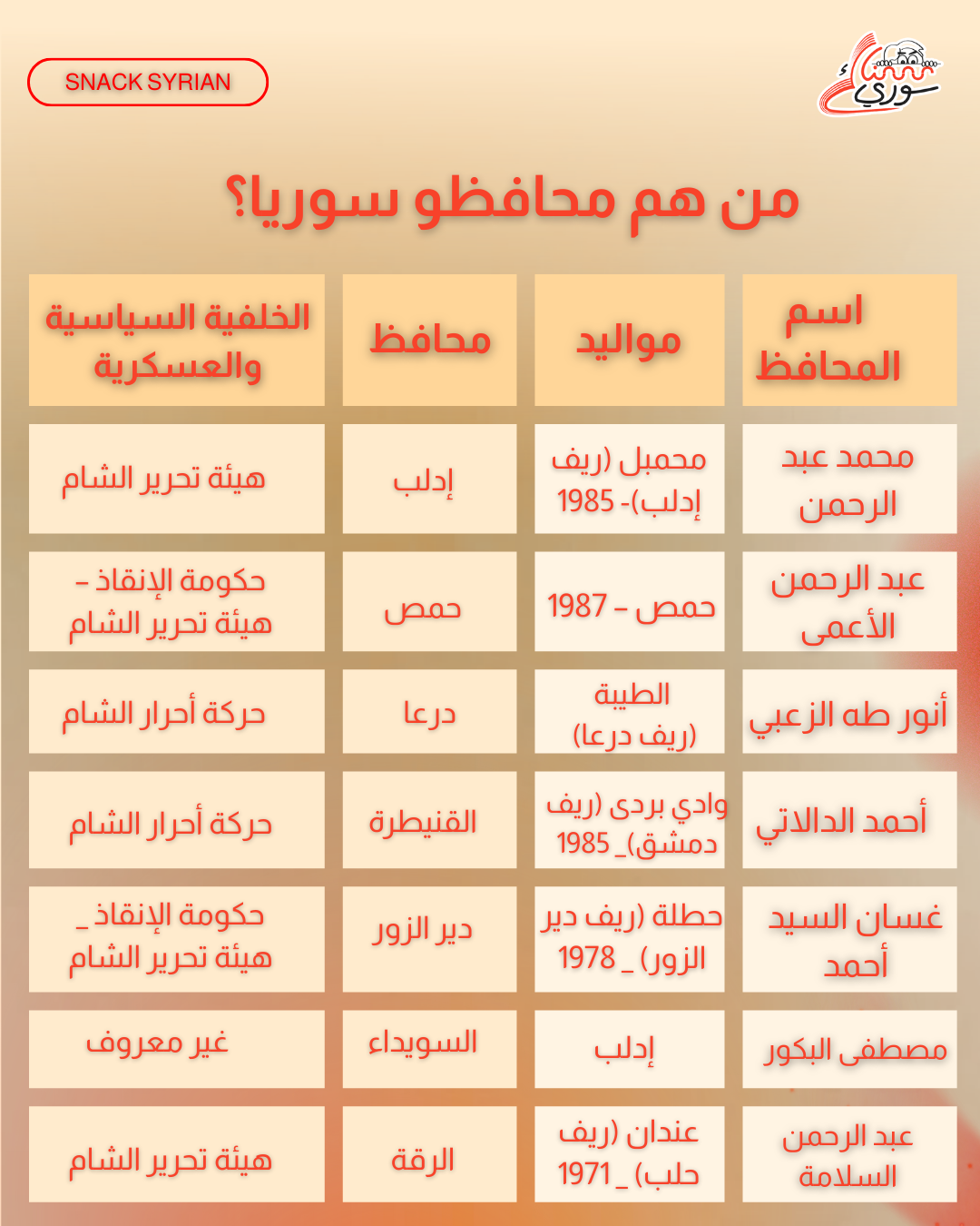 يعد “عبد الرحمن السلامة” أحدث من تم تعيينه في منصب محافظ، حيث صدر في 19 كانون الثاني الجاري قرار بتعيين “السلامة” محافظاً للرقة بعد أن استعادت الحكومة السيطرة عليها بعد انسحاب “قسد” منها.