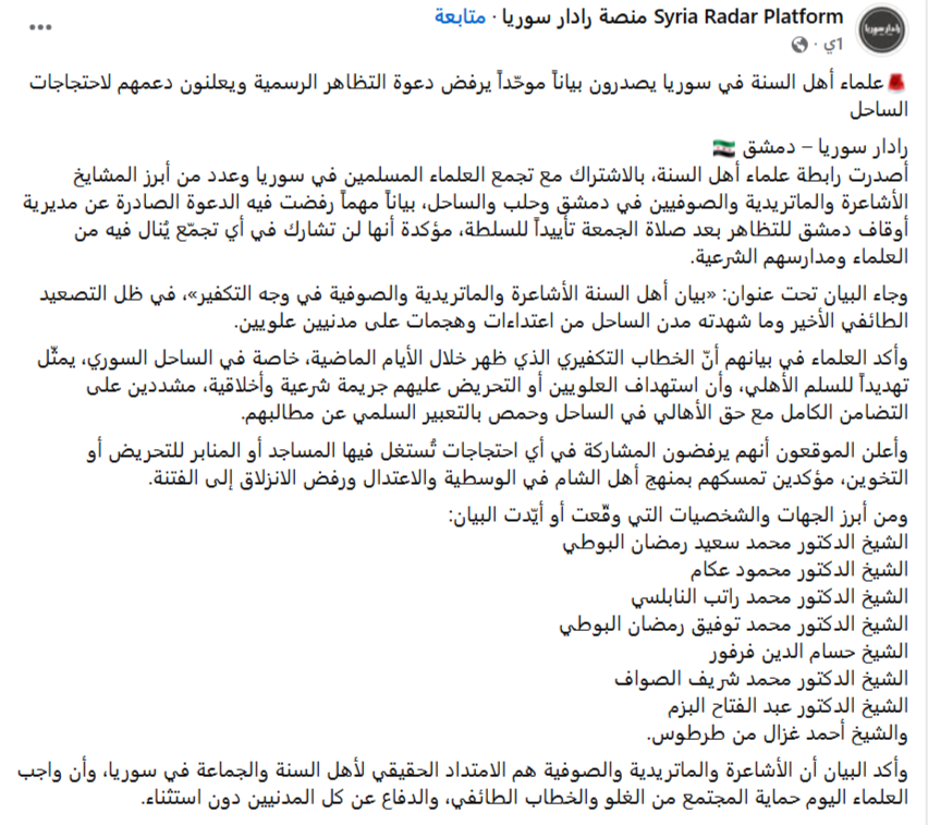 وتداولت صفحات محلية أمس بياناً قالت أنه صدر عن “رابطة علماء أهل السنة” وتجمع العلماء المسلمين في سوريا وأبرز المشايخ الأشاعرة والماتريدية والصوفيين في دمشق وحلب والساحل.