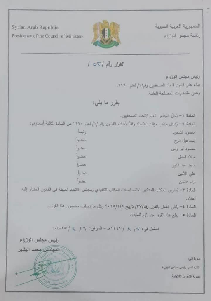 وإذا أردنا أن نلقي نظرة على اتحاد الصحفيين بسوريا اليوم، بوصفه جسماً نقابياً نجد أن رئاسته وجميع أعضاء المكتب التنفيذي حالياً هم من الرجال، وفقاً للقرار /53/ الصادر لهذا العام من قبل رئاسة الحكومة المؤقتة، مع الأخذ بعين الاعتبار أنه كان يضم 3 نساء مقابل 8 رجال.