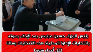 قال رئيس الوزراء السوري “حسين عرنوس” عقب الإدلاء بصوته في انتخابات الإدارة المحلية اليوم الأحد:«هذه الانتخابات رسالة لكل أعداء سوريا».…